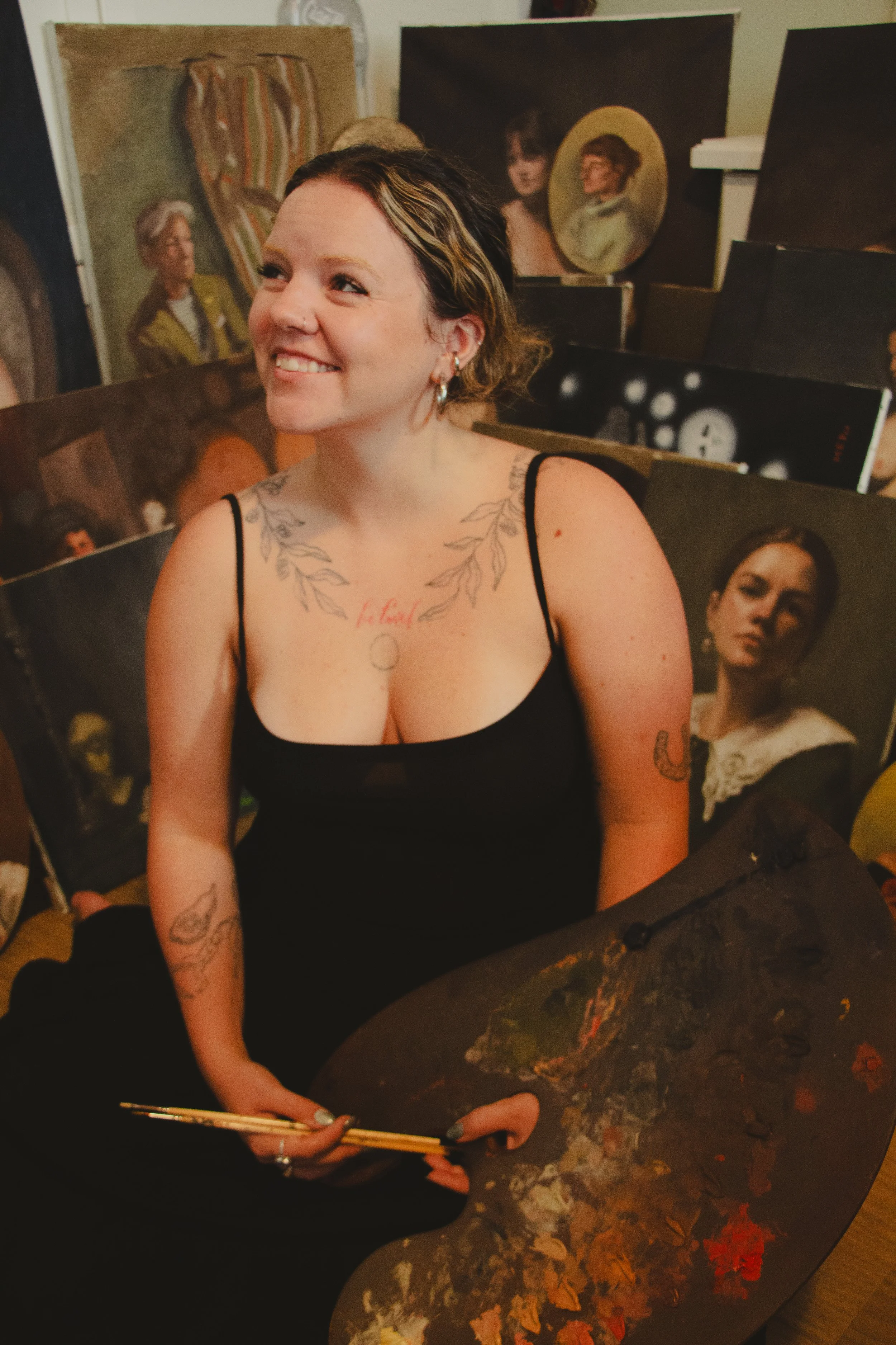 My work is full of people and ghosts and objects pretending to be important. Everything’s a little foggy, a little golden, like a memory that’s not quite yours. My sun babies—those glowing little weirdos—show up a lot. They’re part icon, part in-joke, part diary entry. They’ve made their way onto arms and walls and into the lives of people who didn’t expect them—like most meaningful things.